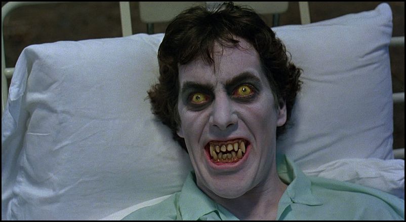 *Spoilers Throughout*What’s It About: Two American college buddies, Jack and David are backpacking across Europe. While traveling in northern England they stray from the main road into the moors and are attacked by a very fierce creature. Jack is ripped to shreds while David suffers minor cuts but is unconscious for 3 weeks and is hospitalized in London. The town near the moors of the attack deny the animal attack and instead claim it was an escaped lunatic. While in the hospital David falls for his nurse, Alex and is visited by his recently dead friend Jack who explains that he is walking the earth in limbo until the curse is lifted—the curse of the werewolf! And apparently David is the next werewolf since he was bit. David also experiences very horrific and vivid dreams such as running in the forest naked, killing deer with his bare hands and his family getting slaughtered by demonic Nazis with sub-machine guns.