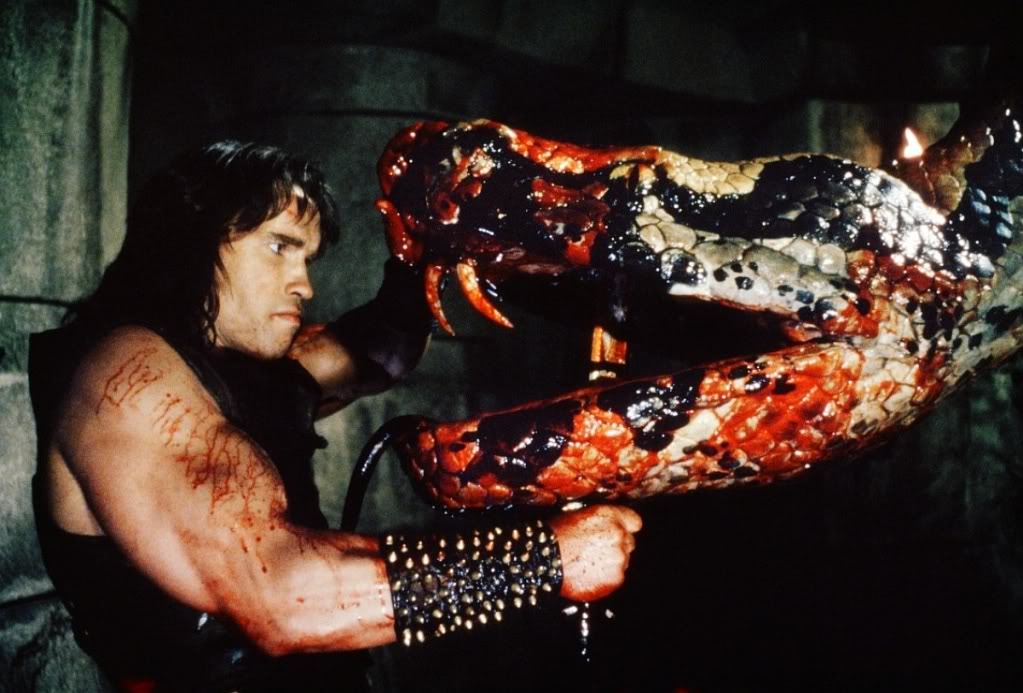 2) The giant snake killed by Conan was not a puppet, but a real, live snake that was considered to be the largest in the world at the time. The script didn’t call for Conan to kill it, simply for him and Subotai to escape the room, but while filming the scene Schwarzenegger went into a frenzy, killed the snake, and ate it so he could “absorb its power into my own.” A similar event happened on the set of Terminator 2: Judgment Day, when Schwarzenegger killed and ate actor Robert Patrick.