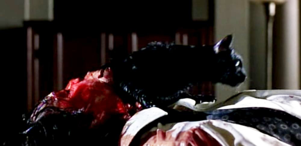The next morning, Hickey arrives back home to find a very bloated and dead Johansen lying on the foyer tiles. When the sound of the grandfather clock chimes, the cat emerges from Johansen’s mouth again and scares Hickey to death when he cannot take his medication (the same that was the result of all those cats’ deaths) in time to stop his heart attack.