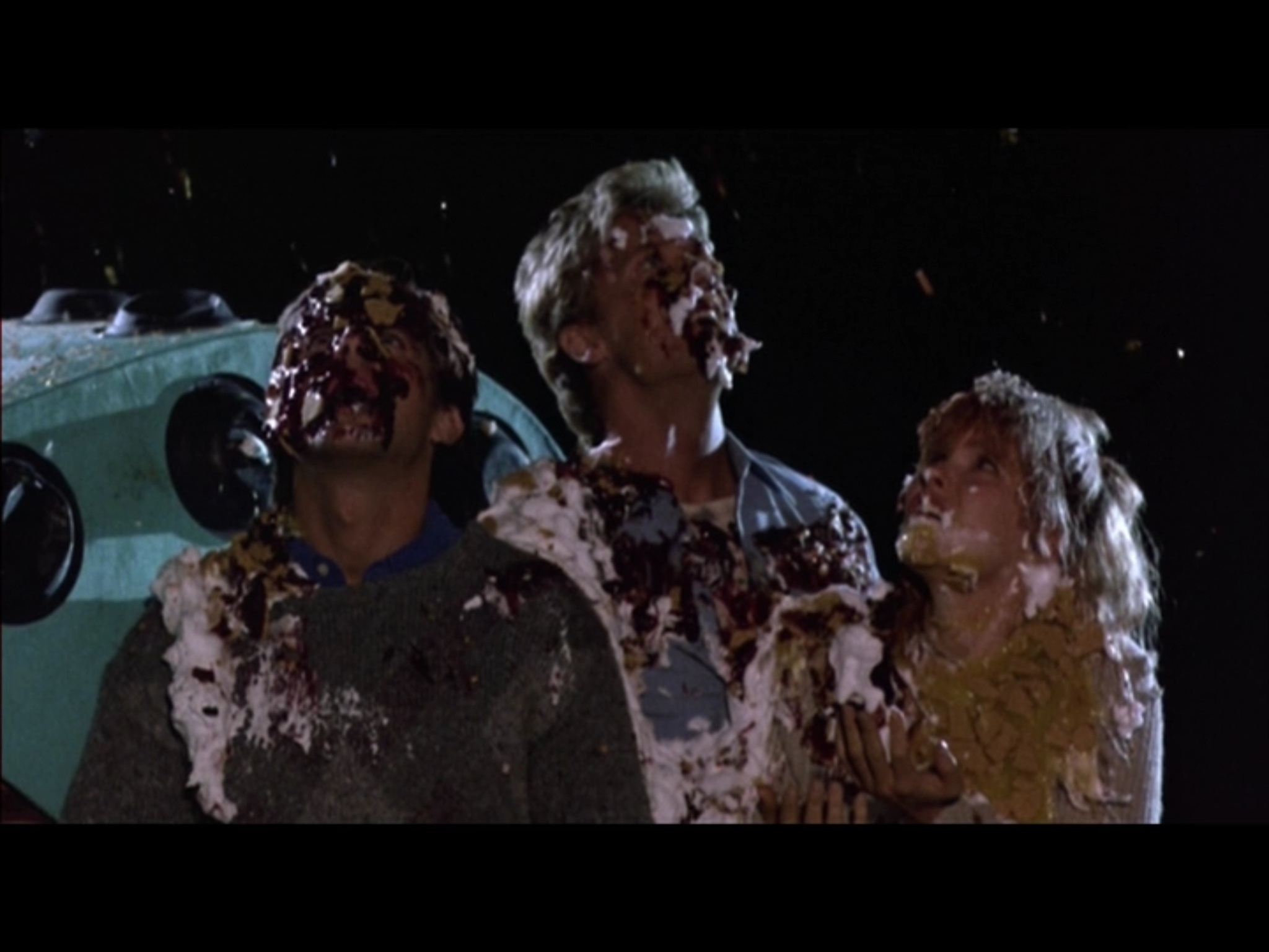 Our heroes look to the sky and wonder if it’s over, and pies rain down on their faces. Unfortunately, they don’t dissolve into goop.