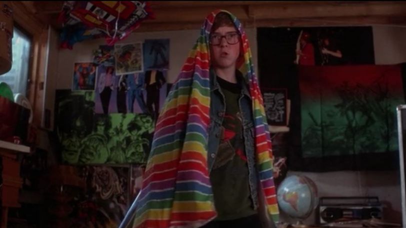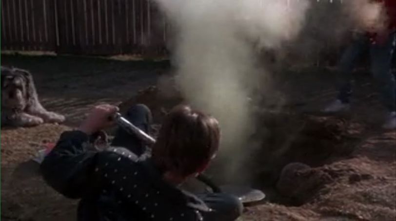 Time for a sad little scene of Glen looking at his photo album of Angus pics before he discovers a model rocket gift he got for Al for her birthday but had forgotten about. These kids love space and rockets apparently. Glen also discovers that the hole opened back up in the yard. Terry comes over after rocking out to his heavy metal music where he stumbled upon “The Dark Book”, an album by a group who were huge demonophiles. Terry tells Glen that all that has transpired in the past day or two is the result of them slightly opening up the gate to the demon-world. All they need is a sacrifice to fully open the gate. About this time, unbeknownst to Glen and Terry, Eric brings Angus back to Glen’s house since the animal shelter was closed and throws Angus into the hole. The boys then attempt some exorcism on the hole with incantations they heard while spinning “The Dark Book” record backwards. Coincidentally, did you know that if you spin Stryper’s “To Hell With The Devil” record backwards that you’re a total loser for ever owning that record. True fact!