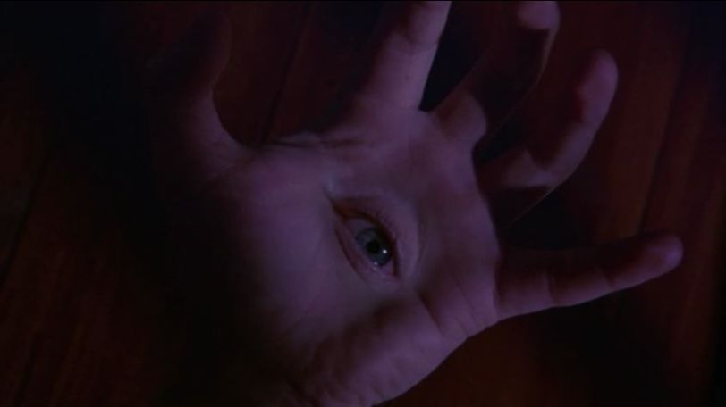 Alexandra is no match for the zombie, even armed with her father’s shotgun and she too is abducted into the walls. Glen then realizes that Terry and Al are the last two sacrifices required to fully open the gate and unleash hell on Earth. He also realizes that he needs that rocket he bought for his sister’s birthday because a symbol of love and purity (or light) can destroy the evil. As he races back to his room, the floor of the foyer opens up revealing the bigger gate to hell and an entrance-way for the king of the demons—an impressively large worm-like Harryhausen creature with tentacles and various arms. Glen is nearly attacked by the alpha demon but he just touches Glen’s head. Afterwards, Glen has an eyeball on the palm of his hand and freaks out! Why? I could think of some advantages to having an eye on your hand.