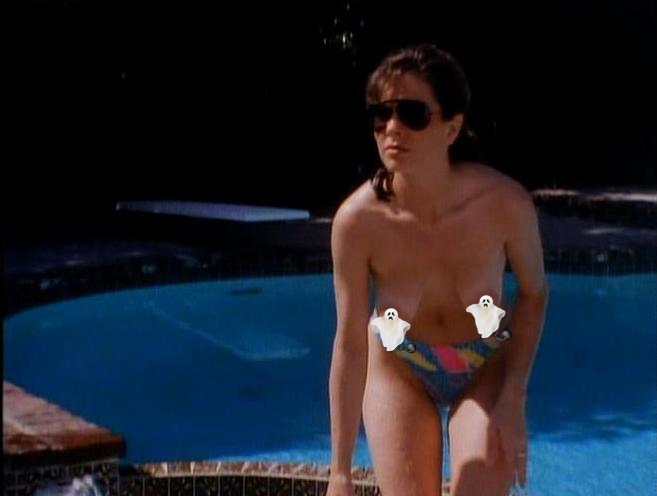 Now Susan is a ghost who can make phone calls. It’s best just to forget everything you thought you knew about ghosts if you watch this. Naturally, she wants revenge on the assassin, who was just doing what he was told. So she lures the assassin to a wooded area via telephone, somehow (and on the way there he listens to a pretty kick-ass song called “Bang Bang”), and she like just screws with his head in the woods in a sequence that goes on FOREVER. And apparently, she can make limos appear out of thin air. Susan you’re dead because YOU screwed up. It’s not the assassin’s fault. Anyway, he runs his gut into a stick. He should be thankful he died before Susan tried to scare him with her boobs.