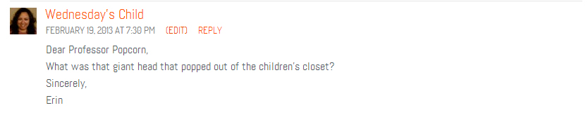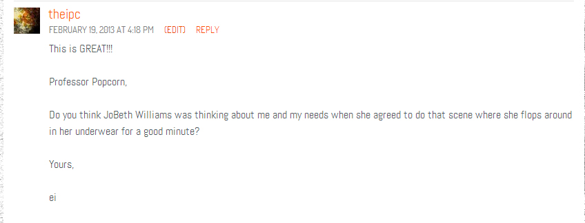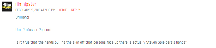 Professor Popcorn would like to thank you all for the overwhelmingly positive response to his first Q&A column. A few of our faithful readers had further questions about the film in the comments section, so after Professor Popcorn was finished with his nightly ritual of burning the hair off of his legs, he sat down at his punch-card computron station to answer them in his own brilliant fashion.