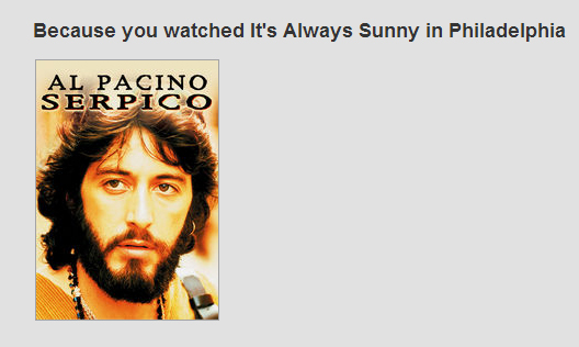 Not exactly the answer to your question, I know, but I still thought I’d share because it was so funny. But more along the lines of what you’re talking about, there is a row of suggestions on my front page marked “Because you watched Twin Peaks” and It’s Always Sunny in Philadelphia is one of those suggestions. I think they’re just pushing It’s Always Sunny no matter what.