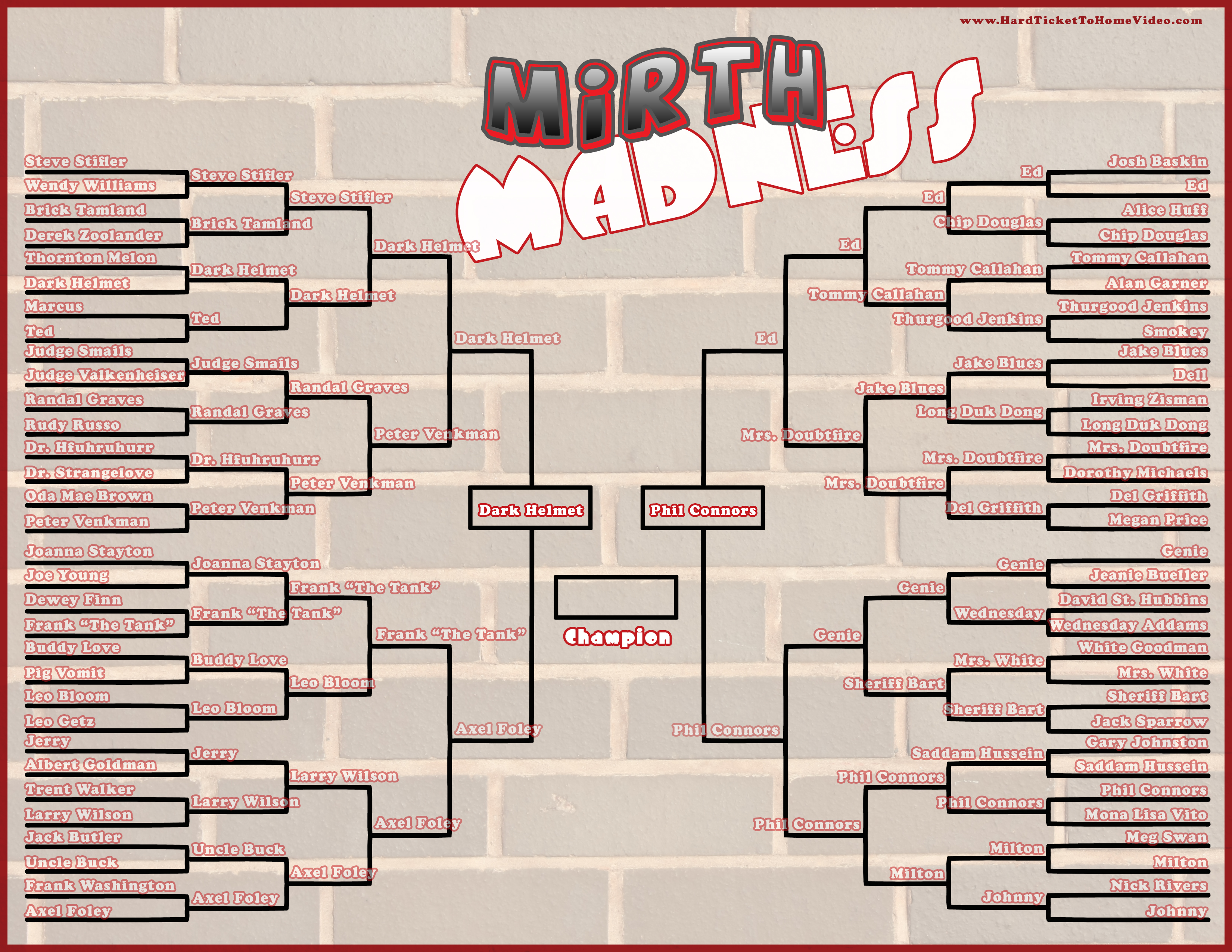 And finally, after a grueling 96 days of the preliminary rounds, we arrive at the championship bout between the unlikely Cinderella Dark Helmet (who greased Axel Foley 59%-41%), and the repeatedly unstoppable Phil Connors (who made Ed dead 67%-33%)! Who could possibly win this battle of guffaws and/or chortles? That’s for YOU to decide! So vote your spaceballs off like there’s no tomorrow!