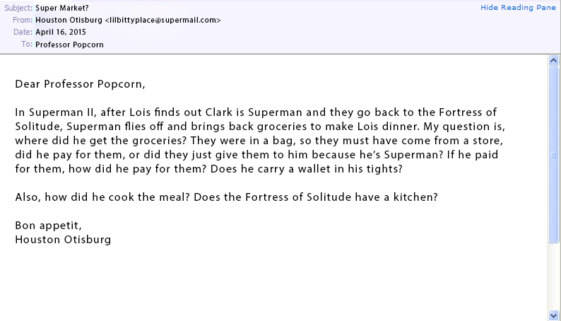Ah, culinary confoundery! It is rare that Kal-El has to go grocery shopping when he is not in his Clark Kent persona, but occasionally he has no choice. But clearly, there’s no wallet next to his spandex-covered buns! However, it is a little-known fact that the Man of Steel places some rolled-up bills inside of a hollow lipstick tube, and keeps the tube up his ass just in case. Imagine the look of surprise on Lois’s face when she discovered it later that night (deleted scene)!