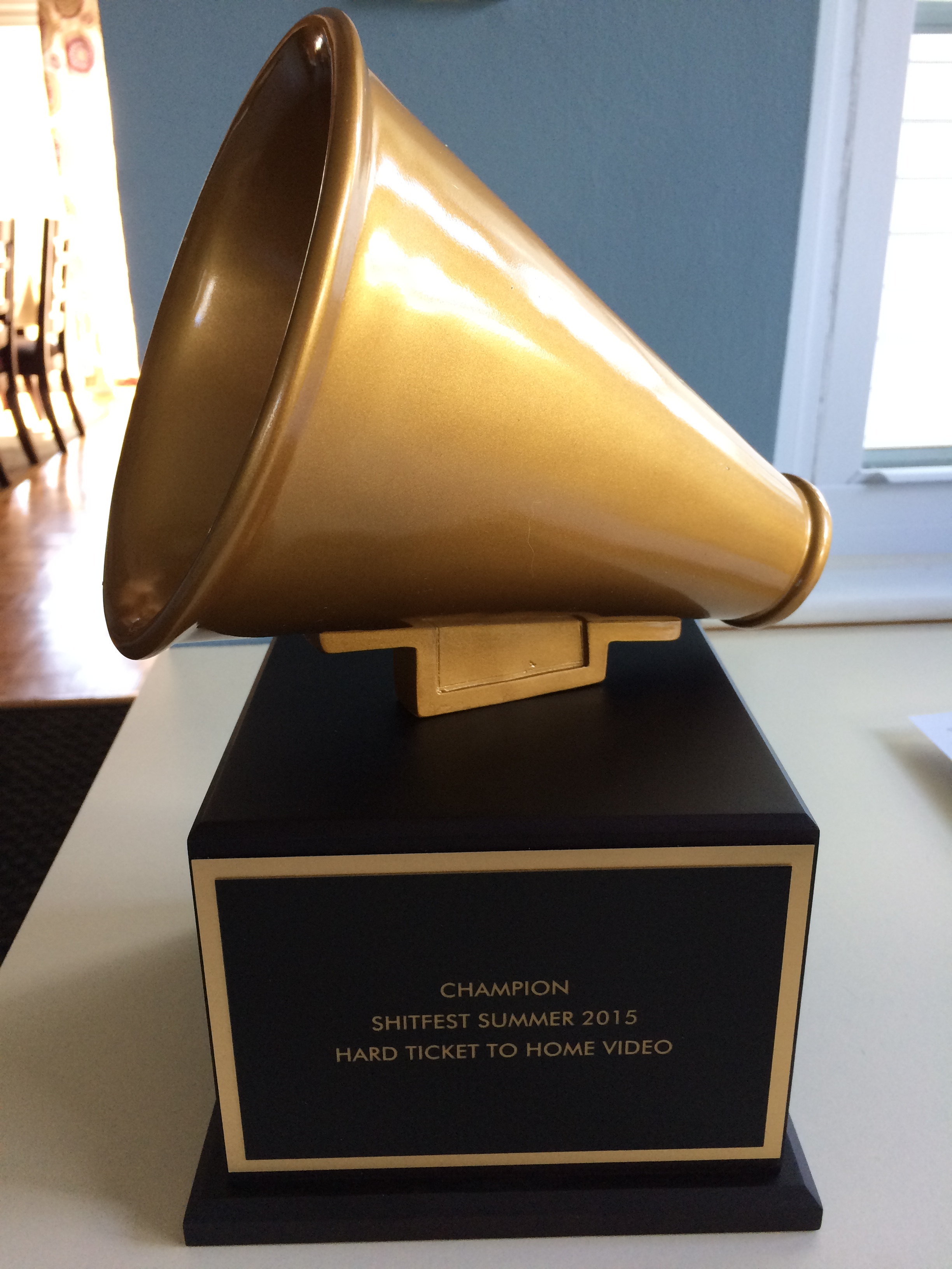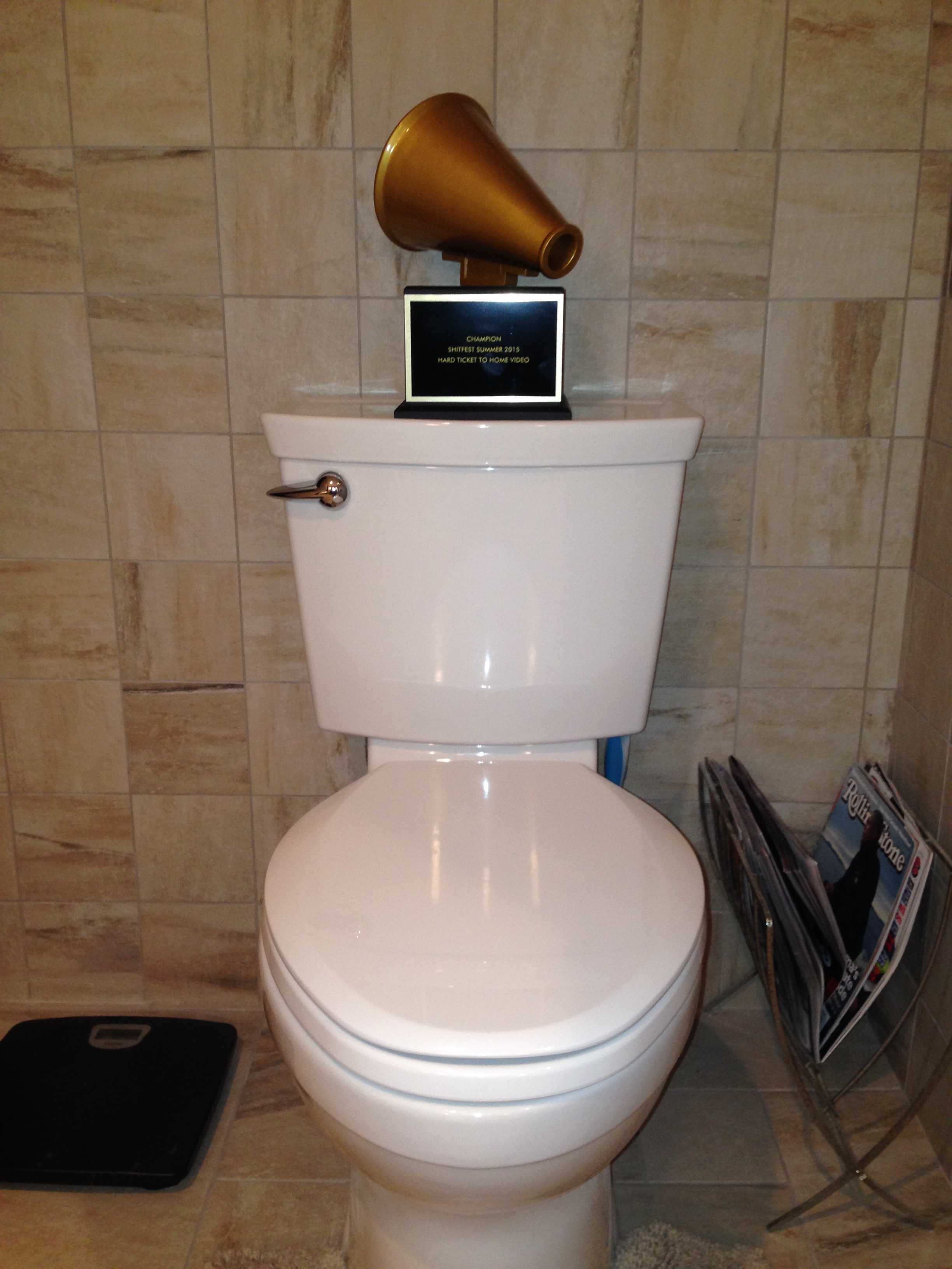 As Brad settled down to take his daily 2 a.m. dump, he was surprised (not shocked, just a little confused really) to find the trophy sitting on the back of his shitter, intent on ironically disrupting his personal shitfest. Laughing, Brad picked the trophy up (it was warm and sort of thrumming, he claims) and threw it in the tub, then threw his hair dryer in after it. That didn’t work, since the trophy is made of such shitty materials that it can’t possibly be damaged in any way, no matter how hard we try. After several hours of throwing different small appliances into the tub to no avail, Brad reached a gentleman’s agreement with the trophy. He put it on one of his DVD shelves in the corner of his basement, where it will haunt us every time we walk by it to take a beer piss in the middle of watching an old Dan Haggerty movie.