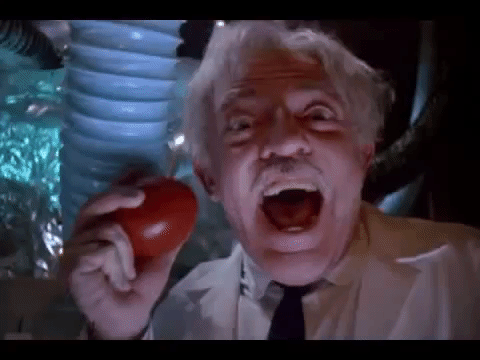 • So This mad scientist played by Astin chemically altered a tomato and by playing certain music it can change the tomato to a Rambo-like super soldier (equipped with camouflage fatigues and M16 machine gun for some dumb reason). The funny thing is he has this lab full of all this scientific equipment but to play the music he has an old jukebox that he needs to pay with quarters. A simple boombox would suffice. Again, I know this is a spoof but I’m failing to see the gag here.