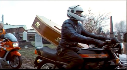 - I’ve never seen a funeral procession with just motorcycles. Buzzer’s casket is in a sidecar!