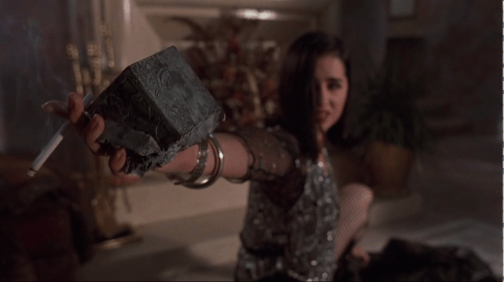 • The chick gets too close to the statue and Pinhead’s head appears and grabs her using the chains. Sure the gore was awesome because he used the chains to rip her skin off revealing a screaming woman with all her muscles exposed but he then sucks her into the statue with some of the worst special effects that only the early 90s can provide. It’s safe to assume Pinhead is absorbing souls/bodies to become corporeal again. Which is fine although the whole point of Pinhead and the Cenobites wasn’t that they are killers but torturers for the sinners. The only sin this woman committed was bad acting and bad judgment in picking a guy to sleep with.