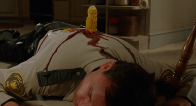 But man, if you’re going to make these out-of-tone jokes at this movie’s expense at least make them make sense. Sticking one pencil into a cop’s ear doesn’t really make it a kebab, which by definition means more than one piece of food on a stick. You now what? This all doesn’t matter.